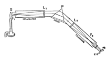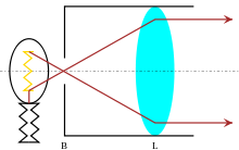 - Grundsätzlich wird mittels einer Sammellinse L (siehe oben stehende Abbildung) das Licht einer mehr oder weniger punktförmigen Quelle in ein paralleles Strahlenbündel verwandelt. Die Lichtquelle ist in der vorderen Brennebene der Linse angeordnet. Beispiel ist die dem Dispersionsprisma eines Prismenspektrometers vorgeschaltete Kollimator-Linse (siehe nebenstehende Abbildung).