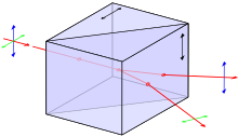 Wird das lichtwellenlängenabhängige (dispersive) Verhalten des Materials eines Prismas ausgenutzt, wird es als Dispersionsprisma bezeichnet. Sie werden z. B. in Prismenspektrometern eingesetzt. Dabei fällt das Licht schräg auf eine Seitenfläche des Prismas, im einfachsten Fall auf ein Prisma in Form eines gleichschenkligen Dreiecks. Durch den schrägen (jedenfalls nicht senkrechten) Einfall und den von der Wellenlänge abhängigen Brechungsindex wird der einfallende Lichtstrahl je nach Wellenlänge mit einem anderen Winkel in das Prisma gebrochen. Dieser Effekt verstärkt sich nochmals an der Austrittsfläche des Prismas, wo der aufgespaltene Lichtstrahl in unterschiedlichen Einfallswinkeln auftrifft. Fällt das Licht nun auf einen Schirm, wird das Spektrum der Lichtquelle sichtbar. Die gemeinsame Kante der beiden beteiligten Flächen (im Diagramm oben) heißt die ablenkende oder brechende Kante, bezüglich der das Licht in die Gegenrichtung abgelenkt wird.