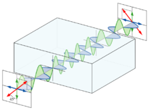 - Ein λ/4-Plättchen verzögert Licht, das parallel zu einer bauteilspezifischen Achse polarisiert ist, um eine viertel Wellenlänge – beziehungsweise π/2 – gegenüber dazu senkrecht polarisiertem Licht. Es kann bei richtiger Einstrahlung aus linear polarisiertem Licht zirkular oder elliptisch polarisiertes Licht machen und aus zirkular polarisiertem Licht wieder linear polarisiertes.
