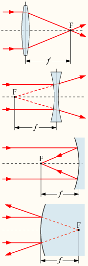 Eine Linse oder Linsengruppe besitzt für die Strahlen, die aus der entgegengesetzten Richtung einfallen, einen zweiten Brennpunkt. Ein Parabolspiegel dagegen hat für beide Richtungen denselben Brennpunkt.