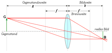 wobei G die Größe des abzubildenden Gegenstandes (Objektes) und B die des Bildes ist. Die Gegenstandsweite oder Objektweite, also der Abstand zwischen Hauptebene der Linse und Objekt, ist hier mit g bezeichnet und die Bildweite, also der Abstand zwischen Hauptebene und Bild, mit b.