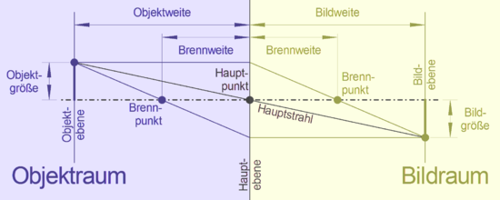 Objektraum (links) und Bildraum (rechts) bei einem konvergenten Strahlengang mit einer reellen Abbildung von einer Objektebene (respektive Gegenstandsebene) über eine Hauptebene in eine Bildebene. Es gibt sowohl einen objektseitigen als auch einen bildseitigen Brennpunkt. Hauptstrahlen gehen durch den Hauptpunkt, werden nicht abgelenkt und verbinden einen Objektpunkt auf gerader Linie mit einem Bildpunkt. Lichtstrahlen, die durch einen der Brennpunkte auf die Hauptebene treffen, werden parallel zur optischen Achse (Strich-Punkt-Linie) abgelenkt und umgekehrt.