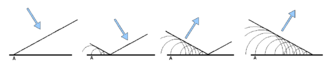 Eine auftreffende Wellenfront erzeugt kreisförmige Elementarwellen um den jeweiligen Auftreffpunkt, deren Radius sich proportional zur Zeit vergrößert. In den folgenden Bildern sieht man, wie die ersten Kreise angewachsen sind, während der aktuelle Auftreffpunkt nach rechts wandert. Die Tangenten an den Kreisen stellen eine neue Wellenfront dar, welche die reflektierende Ebene nach rechts oben verlässt. Die Winkel zwischen Wellenfront und Ebene sind gleich.