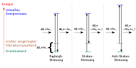 - Anti-Stokes-Raman-Streuung: Energieübertragung auf das Photon vom streuenden Molekül. Dieses befindet sich nach dem Anregungsvorgang auf einem niedrigeren Energieniveau als zuvor, das gestreute Photon besitzt höhere Energie und höhere Frequenz als das anregende Photon.