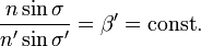 Man betrachtet hierzu Strahlen, die vom Achspunkt des besagten Flächenelements ausgehen. Der Winkel eines solchen Strahls zur optischen Achse (Schnittwinkel) sei σ im Objektraum und σ' im Bildraum. Die Brechzahl im Objektraum sei n, im Bildraum n' Die Sinusbedingung lautet: