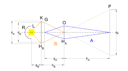 - Abbildungsstrahlengang (A): im Abbildungssystem, bestehend aus dem abzubildenden Gegenstand (G), einem Objektiv (O) und dem auf dem Kopf stehenden, reellen Bild auf einer Projektionswand (P),