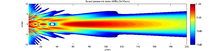 Die Abbildung zeigt ausgeprägte Interferenzstrukturen mit einem unregelmäßigen Wechsel zwischen Orten konstruktiver und destruktiver Interferenz im Nahfeld. Das Fernfeld weist eine regelmäßige Struktur mit einem stetigen Abfall des Schalldrucks mit steigender Entfernung vom Schallwandler auf.