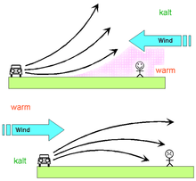 Auch Wind bewirkt räumliche Unterschiede bei der Schallgeschwindigkeit: Da die Windgeschwindigkeit in der Regel mit der Höhe zunimmt, wird der Schall in Windrichtung nach unten hin gebrochen, ist also über weite Entfernungen besser zu hören. Umgekehrt führt eine Schallausbreitung gegen den Wind durch Brechung nach oben zu einer Schattenzone und verminderter Hörbarkeit.