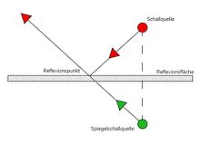 Die Schallreflexion ist mit der Reflexion in der Optik vergleichbar, wenn die Abmessungen des Reflektors mindestens der fünffachen Wellenlänge entspricht. In den anderen Fällen kommt es zu Beugungseffekten. Der einfachste Fall ist eine Reflexion an einer ebenen Fläche. Hierfür gilt die Regel: Einfallswinkel ist gleich dem Reflexionswinkel. Die gilt lokal auch für homogen gekrümmte Flächen. Als Reflexionsfläche legt man die Tangente durch den Reflexionspunkt. An der Reflexionsfläche kann sich die Schallquelle virtuell spiegeln und auf der anderen Seite der Fläche abbilden. Diese neue Schallquelle wird als Spiegelschallquelle bezeichnet.