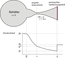 - Aus der Gleichung von Hugoniot kann entnommen werden, dass bei Erreichen der Schallgeschwindigkeit und dc > 0 eine weitere Geschwindigkeitserhöhung dann möglich ist, wenn dA > 0 und der Querschnitt als Diffusor ausgebildet ist.