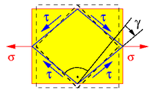 In einem allgemeinen Belastungsszenario können Zug-, Druck- und Scherkräfte auch kombiniert auftreten. Dies hat ebenso komplexe Dehnungen in allen drei Raumrichtungen zur Folge. Der Dehnungszustand ist zudem vom zugrunde gelegten Bezugssystem abhängig. So tritt bei der Dehnung der quadratischen Scheibe im Bild auch eine Scherung γ auf. Die diesem Umstand gerecht werdende, vollständige mathematische Beschreibung des Dehnungsszustands erfolgt über Tensoren der Kraft bzw. Dehnung. Der Verzerrungstensor ε ist – wie auch der Spannungstensor σ – grundlegend für die Elastizitätstheorie fester Körper; sie bilden insbesondere das Grundgerüst für Computermodelle der Verformungssimulation, wie sie z.B. mit der Finite-Elemente-Methode ausgeführt werden kann.
