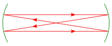 - Ein Resonator besteht zum Beispiel aus zwei parallelen Spiegeln, zwischen welchen sich das aktive Lasermedium befindet. Photonen, deren Propagation senkrecht zu den Spiegeln verläuft, verbleiben im Resonator und können daher mehrfach die Emission weiterer Photonen im aktiven Medium auslösen (stimulieren). Ein auf diese Weise entstehendes Photon entspricht in allen Quantenzahlen dem auslösenden Photon. Spontane Photonen, die den Resonator zum Beispiel quer verlassen, stimulieren dementsprechend eher keine weiteren Photonen. Diese Selektion des Resonators führt zur engen Abstrahlrichtung von Laserstrahlung. Manche Resonatoren sind auch wellenlängenselektiv (dichroitische Spiegel, Bragg-Gitter) und können dadurch die anschwingenden longitudinalen Moden weiter einschränken. In manchen hochverstärkenden Lasermedien ist ein Resonator zum Erzielen stimulierter Emission nicht zwingend erforderlich.
