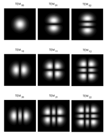 Bei zylindrischem Querschnitt des Lasers hat die Strahlintensität im Idealfall ein Gauß-Profil; diese Mode wird als TEM00-Mode bezeichnet (siehe auch: Moden#Weitere akustische Moden). Es können aber auch andere Profile mit Winkel- und radialen Abhängigkeiten auftreten, die sich durch Laguerre-Polynome berechnen lassen. Ist diese Zylindersymmetrie durch Polarisationsfilter oder Brewster-Fenster gestört, treten rechteckige Symmetrien auf, die durch Hermitesche Polynome berechnet werden. Abhängig von der Anzahl ihrer Knotenlinien in horizontale und vertikale Richtung werden sie als TEMxy-Mode bezeichnet. Für diese Moden ist teilweise der Lichtweg durch den Resonator bis zum Ausgangspunkt anders, das heißt, die Resonatorlänge erscheint verändert. Dies kann zu einer Verfälschung der Longitudinalmodenspektren führen, indem sich die Spektren verschiedener Transversalmoden überlagern.
