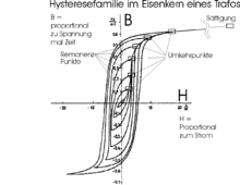 Entmagnetisiert werden Materialien meist durch ein erst starkes Wechsel-Magnetfeld, das dann allmählich abklingt. Dieses Magnetfeld muss so stark sein, dass die Koerzitivfeldstärke des aufmagnetisierten Materials erreicht wird. Durch das Wechselfeld erfolgt eine Ummagnetisierung der dauermagnetischen Materialien mit abnehmender Amplitude. Damit wird die Hysteresekurve mit abnehmender Amplitude der magnetischen Feldstärke und der Magnetflussdichte durchlaufen, bis das Dauermagnetfeld null ist. Im nebenstehenden Bild beginnt man beispielsweise rechts oben, dann geht es immer entgegengesetzt dem Uhrzeigersinn nach links unten, dann wieder nach rechts oben, aber nicht mehr so weit etc. Wenn nach vielen Umläufen die kleinste Schleife am Schnittpunkt der beiden Achsen erreicht ist, kann man das externe Magnetfeld abschalten, das Eisen ist weitgehend entmagnetisiert.