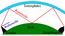 Im Kurzwellenbereich hat die Bodenwelle eine sehr geringe Reichweite und spielt nur im CB-Funk (11-m-Band) eine nennenswerte Rolle für Ortsgespräche. Die Raumwelle dagegen kann bei richtiger Frequenzwahl an der Ionosphäre reflektiert werden und wieder zurück zur Erdoberfläche wandern. Aus diesem Grund besitzen Kurzwellensender> eine sehr große Reichweite und können sogar weltweit empfangen werden.