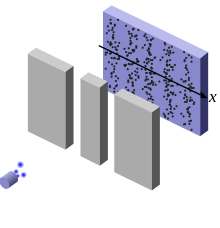 Klassische Teilchen (also einzelne Massepunkte) zeigen keine Interferenz (siehe Abbildung 2). Sie gelangen entweder durch den linken oder den rechten Spalt und treffen dann jeweils innerhalb eines klar abgegrenzten Bereichs auf den Schirm. Folglich erscheinen auf dem Schirm genau zwei helle Streifen (je einer für einen der beiden Spalte). Bei genauerer Betrachtung fällt die körnige Struktur der beiden Streifen auf. Jedes Teilchen trifft an genau einer Stelle auf und hinterlässt dort einen hellen Punkt. Es gibt keinen kontinuierlichen Helligkeitsverlauf. Ein Ort ist entweder hell oder dunkel markiert, denn entweder wurde er von einem Teilchen getroffen oder nicht.