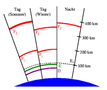 | F1 | ca. 200 km | tagsüber vorhanden, geht nachts mit F2-Schicht zusammen |