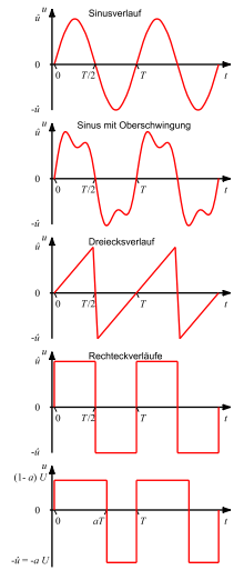 Schwingungen sind ausschließlich Funktionen der Zeit. Die Periode heißt hierbei auch Periodendauer oder Schwingungsdauer (selten: Schwingungszeit). Man bezeichnet sie üblicherweise mit dem Formelzeichen T und gibt sie an in der Maßeinheit Sekunde mit dem Einheitenzeichen s. Beispiele für periodische Funktionen in Form von Wechselspannungen zeigt das Bild.
