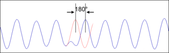 Die Antwort eines Faxes, wenn es angerufen wird. Das erste Signal ist ein reiner Sinuston, dem mehrfach ein Knackgeräusch überlagert ist. Dabei handelt es sich um eine Phasenschiebung um 180°, siehe Bild. Sie kann eine Information von genau einem Bit übertragen. Deshalb wird sie als binäre Phasenschiebung (binary phase shift keying) bezeichnet.