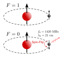 Beim Wasserstoffatom können die Spins von Elektron und Proton parallel oder antiparallel stehen. Der antiparallele Zustand besitzt geringfügig höhere Energie, die bei Zurückklappen als Photon abgestrahlt wird. Diese Strahlung ist eine wichtige Nachweismethode der Astronomie für stark verdünntes Wasserstoffgas.