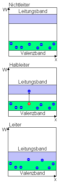 Auch bei Halbleitern und Isolatoren am absoluten Nullpunkt (Temperatur) ist das höchste Energieband vollständig mit Elektronen besetzt, dieses Band wird Valenzband genannt. Im Gegensatz zu Metallen überlappt dieses Band nicht mit dem nächsthöheren Band, dem am absoluten Nullpunkt unbesetzten Leitungsband. Zwischen beiden Bändern liegt ein quantenmechanisch „verbotener Bereich“, der Bandlücke genannt wird. Da das Valenzband bei 0 K voll besetzt ist, kann kein Ladungstransport stattfinden. Führt man dem Material durch Temperaturerhöhung oder Lichteinstrahlung ausreichend Energie zu, können Elektronen die Bandlücke überwinden und ins Leitungsband angehoben werden. Auf diese Weise kann ein unbesetztes Leitungsband teilbesetzt werden. Diese Elektronen und die im Valenzband zurückbleibenden Löcher tragen beide zum elektrischen Strom bei (Eigenleitung).