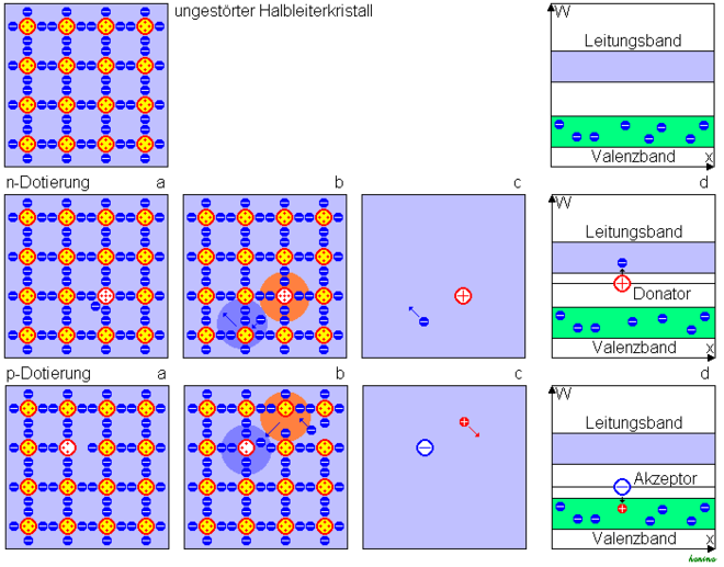 Durch Dotierung kann ein Halbleiter gezielt mit Ladungsträgern ausgestattet werden. Der Halbleiterkristall beruht auf einem Kristallgitter aus 4-wertigen Atomen, die jeweils durch vier Elektronenpaare gebunden sind. Dotierung mit 5-wertigen Atomen hinterlässt im Gitter ein für die Bindung nicht erforderliches Elektron, das somit nur locker gebunden ist (Abbildung unten, Bild a). Mit nur geringer Energie kann es daher ins Leitungsband angehoben werden und ist hier beweglich (Bild b). Ein solches Atom nennt man einen Elektronen-Donator (lateinisch donare ‚geben‘). Der Kristall wird mit beweglichen negativen Ladungsträgern ausgestattet, man spricht von einer n-Dotierung. Zugleich bleibt ein positiver Atomrumpf im Gitter zurück. Lässt man den Hintergrund der neutralen Grundsubstanz außer Betracht (Bild c), so hat man eine positive feste und eine negative bewegliche Ladung ins Gitter eingebracht. Energetisch liegt ein Donator knapp unterhalb des Leitungsbandes, da wegen der schwachen Bindung des „zusätzlichen“ Elektrons wenig Energie zur Anregung ins Leitungsband vonnöten ist (Bild d).