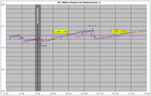 Man sieht auch, dass die Abnahme nicht gleichmäßig erfolgt. Ursache hierfür sind Änderungen in der Dichte der „hohen“ Atmosphäre, die durch die unregelmäßige Aktivität der Sonne verursacht werden. Um eine längerfristige Tendenz zu ermitteln, kann man trotzdem einen linearen Trend berechnen. Im Diagramm ist dies ab dem letzten Orbit-Reboost dargestellt. Die Steigung bzw. Sinkrate der Regressionsgeraden (y = m·x + b) beträgt im Durchschnitt −81,7 Meter pro Tag.