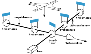 | Mittleres Frequenzband | 10−1 Hz | 101 Hz | 3·107 m | 3·109 m | weltraumbasierte Laser-Interferometrie, Armlänge 1.000–60.000 km |