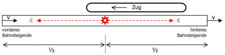 In der Mitte des Bahnsteiges steht eine Lampe. Für einen Beobachter, der auf dem Bahnsteig steht, ist unmittelbar klar: Wenn die Lampe eingeschaltet wird, dann erreicht das Licht beide Enden des Bahnsteigs gleichzeitig: Es hat ja in beide Richtungen denselben Weg zurückzulegen. Betrachten wir nun die Situation aus der Sicht eines Fahrgastes des Zuges: Der Bahnsteig bewegt sich nun mit konstanter Geschwindigkeit v nach hinten. Das Licht besitzt aber auch gegenüber dem Zug in beiden Richtungen die Geschwindigkeit c. Zum Zeitpunkt des Aussendens sind beide Bahnsteigenden gleich weit von der Lampe entfernt. Somit kommt das vordere Bahnsteigende dem Lichtstrahl entgegen, sodass das nach vorne laufende Licht eine kürzere Strecke zurücklegt, bis es dieses Bahnsteigende erreicht. Umgekehrt bewegt sich das hintere Bahnsteigende in Richtung des ihm nacheilenden Lichtes, sodass das Licht hier einen etwas längeren Weg zurücklegen muss, bis es dieses Ende erreicht hat. Daher wird das Licht das vordere Bahnsteigende früher erreichen als das hintere, und somit werden die beiden Enden des Bahnsteigs nicht gleichzeitig erreicht.