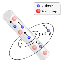 Dazu betrachtet man eine einzelne negative elektrische Probeladung in gewissem Abstand neben einem Draht, der insgesamt elektrisch neutral ist, aber aus einem positiv geladenen, starren Grundmaterial (den Atomrümpfen) und vielen negativ geladenen, beweglichen Elektronen besteht. In der Ausgangssituation ruht die Probeladung und im Draht fließt kein Strom. Daher wirkt auf die Probeladung weder eine elektrische noch eine magnetische Kraft. Nun betrachtet man den Fall, dass die Probeladung außerhalb und die Elektronen innerhalb des Drahtes sich mit gleicher Geschwindigkeit längs des Drahtes bewegen. Im Draht fließt dann ein Strom. Dieser erzeugt ein Magnetfeld, welches auf die Probeladung, weil sie sich bewegt, die Lorentzkraft ausübt, die sie radial zum Draht hinzieht. Soweit die Beschreibung in dem Bezugssystem, in dem das positive Grundmaterial des Drahtes ruht.