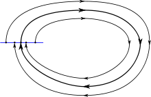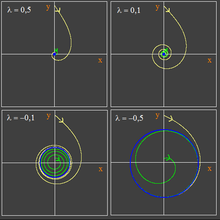 - Entfernen sich benachbarte Trajektorien dagegen im Grenzwert unendlicher Zeit (bzw. laufen im Grenzwert unendlich negativer Zeit auf den Grenzzyklus zu), so ist der Grenzzyklus ein eindimensionaler Repellor bzw. negativer Attraktor und wird instabil genannt.