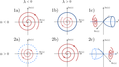 Neben stabilen und instabilen Grenzzyklen gibt es auch semistabile Grenzzyklen, d.h. außen liegende Trajektorien spiralen auf den Grenzzyklus zu und innen liegende spiralen von ihm weg (oder umgekehrt).