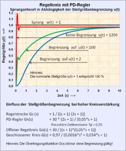 - Eine Stellgrößenbegrenzung eines Reglers ist unvermeidbar, wenn die Ausgangsleistungsstufe des Reglers, z. B. die Ausgangsspannung, nicht weiter wachsen kann. Je nach Größe der Begrenzung kann eine Sprungantwort stark verzögert werden.