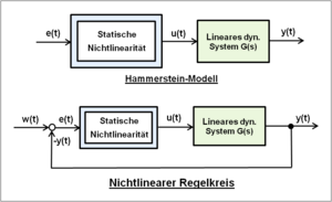- Definition nichtlineares System: Statische kontinuierlich nichtlineare Systeme ändern ihre Verstärkung nach einer bestimmten Funktion. Nichtlineare dynamische Systeme bereiten in der Systemberechnung Probleme, weil sie selten analytisch lösbar sind. Übliche Systembeschreibungen erfolgen durch die numerische zeitdiskrete Berechnung mit logischen Befehlen und Differenzengleichungen. Nichtlineare dynamische Systeme können zur einfacheren Berechnung auch durch Modelle in Kombinationen von nichtlinearen Systemen ohne Zeitverhalten und linearen dynamischen Systemen aufgeteilt werden, z.B. nach dem Hammerstein-Modell. Nichtlineare statische Modelle sind meist Unikate.