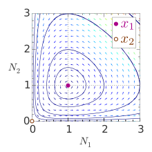 Eine Methode zur Stabilitätsanalyse ist, das System um den Gleichgewichtszustand zu linearisieren. Mit dem Satz von Hartman-Grobman lässt sich der Gleichgewichtszustand dann anhand der Eigenwerte der Jacobi-Matrix charakterisieren.