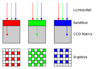 Zu diesem Zweck könnten drei separate Sensoren in Verbindung mit einem Strahlteiler verwendet werden, um jede der drei Grundfarben an jedem Pixel genau zu messen. Dieser Ansatz ist jedoch teuer und mechanisch schwierig zu implementieren. Um dieses Hindernis zu überwinden, wurde das Farbfilterarray eingeführt, um ein Farbbild mit nur einem Sensor aufzunehmen. Ein Farbfilterarray ist eine Anordnung alternierender Farbfilter, die an jedem Pixelort nur eine Farbe abtasten.