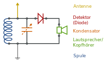 Die Spule und der Drehkondensator stellen dabei einen Schwingkreis dar, der auf die gewünschte hochfrequente Trägerfrequenz abgestimmt ist. Die empfangene Spannung, deren Amplitude in Abhängigkeit vom Nutzsignal schwankt, wird über die Diode gleichgerichtet, wodurch am Kopfhörer als Spannungsverlauf die Hüllkurve des Nutzsignals anliegt – die höheren Frequenzanteile der Sendefrequenz werden durch die Induktivität des Kopfhörers unterdrückt.