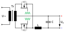 In der rechts dargestellten Schaltskizze als Teil eines Schaltreglers wird links die Wechselspannung über einen Transformator auf das benötigte Spannungsniveau transformiert, über die beiden MOSFETs gleichgerichtet und die Ausgangsspannung U0 mittels Spule L und Kondensator C geglättet. Die Ansteuerung der MOS-FETs erfolgt durch die gleiche Controllerschaltung, die auch die Eingangsfrequenz erzeugt; somit ergibt sich das Timing der MOS-FET-Ansteuerung zwanglos. Die Controllerschaltung fehlt der Übersichtlichkeit wegen in der Schaltskizze.