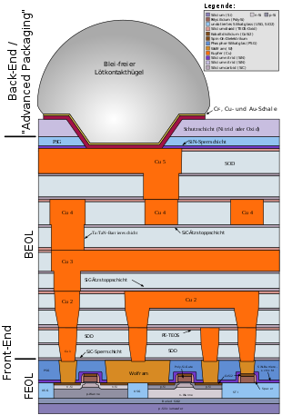 - Back-End-of-Line (engl. back-end of line, BEOL, dt. ‚hinteres Ende der Produktionslinie‘): Dieser Schritt umfasst im Wesentlichen die sogenannte Metallisierung, bei der die im FEOL gefertigten Bauelemente miteinander verbunden werden, und die abschließende Passivierung der Oberfläche.