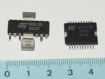 ICs im Kunststoffgehäuse. Die großflächigen Metallfahnen (beim rechten Baustein in den Kerben) dienen der Wärmeabfuhr, sie können auf eine große Massefläche gelötet oder mit einem Kühlkörper versehen werden. -