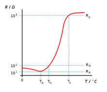 Wird der Kaltleiter noch weiter erwärmt, so wirkt der Anstieg der Ladungsträgerdichte nun wieder der Isolierung durch die Verarmungsrandschichten entgegen, so dass es zu einer leichten Abnahme des Widerstands kommt. Dieses Verhalten ähnelt wiederum dem eines Heißleiters.