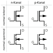 Je nach Dotierung des Grundmaterials lassen sich sowohl n- als auch p-Kanal-MOSFETs herstellen. Diese können auch in Form selbstleitender oder selbstsperrender Typen im Rahmen der Herstellungsprozesse konfiguriert werden. Die Schaltsymbole umfassen damit vier mögliche Variationen wie in nebenstehender Abbildung dargestellt. Dabei ist erkennbar, dass die selbstleitenden MOSFETs, auch als Verarmungstyp bezeichnet, eine durchgezogene Linie zwischen den Anschlüssen Drain und Source aufweisen. Diese Linie ist bei den selbstsperrenden Typen, auch als Anreicherungstyp bezeichnet, unterbrochen. Der Pfeil wird bei diesen Transistoren am Bulk-Anschluss eingezeichnet und bei einem n-Kanal-Typ zu dem Transistorsymbol orientiert, bei einem p-Kanal vom Transistor weg gezeichnet. Der Bulk-Anschluss ist oft fest mit dem Source-Anschluss direkt am Halbleiter verbunden.