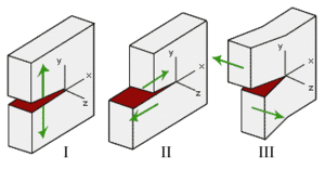 - Modus III: Beanspruchungen, die eine Verschiebung der Rissflanken quer zur Rissausbreitungsrichtung bewirken. Diese Beanspruchungsart taucht z.B. in Wellen auf, die unter Torsionsbeanspruchung stehen und bei denen ein Riss senkrecht zur Wellenachse verläuft.
