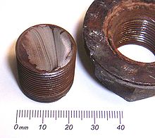 In der Bruchfläche sind die Zonen des Bruches zu erkennen: links ein schon länger bestehender Anriss (dunkel); zur Mitte hin der Bereich des unter Wechselbelastung fortschreitenden Ermüdungsbruches mit Rastlinien, von rechts eine weitere Ermüdungsbruchzone, dazwischen die schmale Gewaltbruchzone