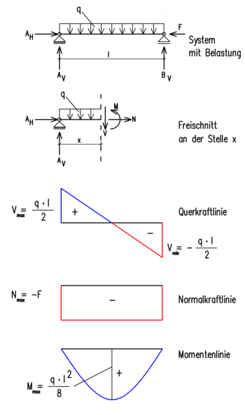 - Die Normalkraft, die senkrecht (normal) zur Schnittfläche wirkt, also in Richtung der Stabachse.