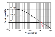 - Bei der Transitfrequenz fT ist die Verstärkung auf den Wert 1 (oder 0 dB) gesunken (roter Punkt im Bild). Bei noch höherer Frequenz kann die Rückkopplung den OP gemäß dem Stabilitätskriterium von Barkhausen nicht mehr zum Oszillieren bringen.