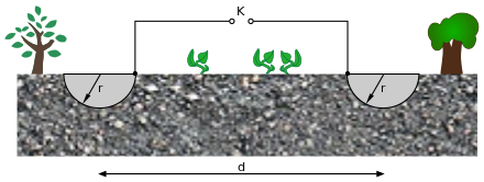 Bei einem Halbkugelerder breitet sich der Strom vom Kugelmittelpunkt ausgehend radialsymmetrisch im Erdreich aus. Dies ist jedoch nur dann möglich, wenn das Erdreich homogen ist. Die Fläche, die dem Strom beim Austritt aus dem Erder zur Verfügung steht, ist zunächst relativ klein, sie wird aber mit zunehmender Entfernung vom Erder immer größer. In nebenstehender Skizze sind zwei metallische Halbkugeln mit dem Radius r mit Abstand d zueinander im Erdreich vergraben. Dabei ist vorausgesetzt, dass der Abstand d wesentlich größer als der Kugelradius r ist. In diesem Fall ist der an den Klemmem K zu messende Widerstand Rk unabhängig von der Entfernung d, dies ist durch den großen Querschnitt des Erdreichs bedingt. In Abhängigkeit vom Radius des Erders und vom Bodenwiderstand ρ in der Umgebung des Erders wird der Widerstand Rk nach folgender Gleichung bestimmt: