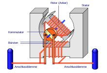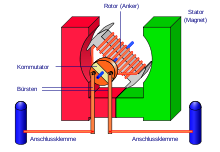 Eine oder mehrere Spulen auf dem Anker werden in einem magnetischen Feld des Stators so platziert, dass die Lorentzkraft und teils auch die Reluktanzkraft ein Drehmoment erzeugt. Die Wicklungen des Ankers werden hierzu über einen Kommutator (Polwender) angeschlossen. Die Schleifkontakte am Kommutator (Metallbürsten oder Kohle„bürsten“) wechseln während der Drehung die Polung der Ankerwicklungen so, dass immer diejenigen Wicklungen von Strom entsprechender Richtung durchflossen werden, die sich quer zum Erregerfeld bewegen. An den Bürsten ist eine pulsierende Gleichspannung abgreifbar. Durch mehrere räumlich versetzte Windungsschleifen (Wicklungen) erhält man eine Glättung des Spannungsverlaufs.