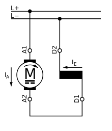 Die Anschlüsse des Ankers werden mit A1 und A2 bezeichnet, die der Erregerwicklung mit D1 und D2. Bei der dargestellten Schaltung dreht der Motor im Uhrzeigersinn, erkennbar am eingezeichneten Pfeil im Anker.