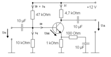 - In der oberen Schaltung ist er frequenzunabhängig und sollte so gewählt werden, dass die Kollektorspannung um den Mittelwert (hier ca. 5 V) möglichst symmetrisch schwanken kann, ohne in die Übersteuerung (clipping) zu geraten und so Verzerrungen zu verursachen. Der Frequenzbereich wird durch die Koppelkapazitäten an Ein- und Ausgang nach unten und durch den Transistor und die Schaltkapazitäten nach oben begrenzt.